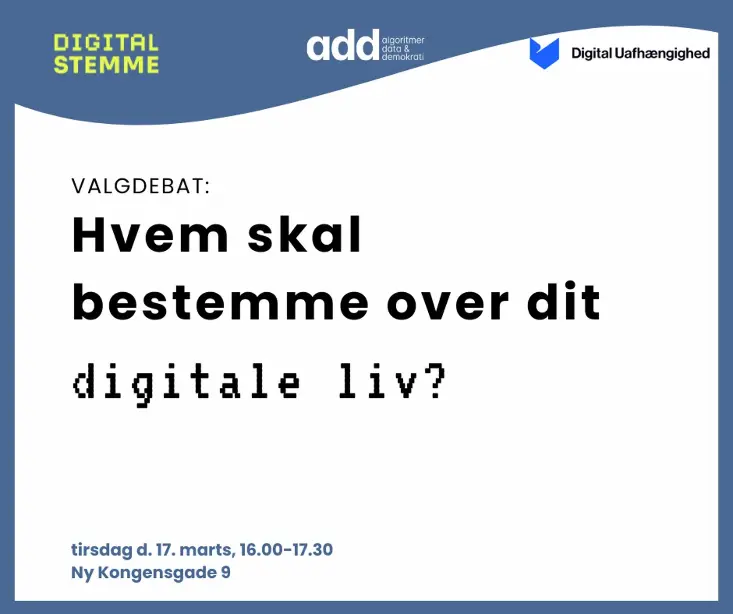 Tirsdag 17/3 kl 16-17.30 afholder vi en valgdebat om digital suverænitet sammen med Digital Stemme og Mandag Morgen for at til at løfte emnet højere op på dagsordenen i valgkampen – og i dansk politik generelt. For beslutningerne om vores digitale fremtid er i virkeligheden også beslutninger om vores demokrati.