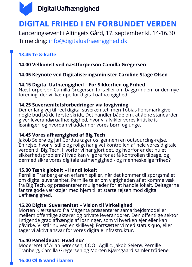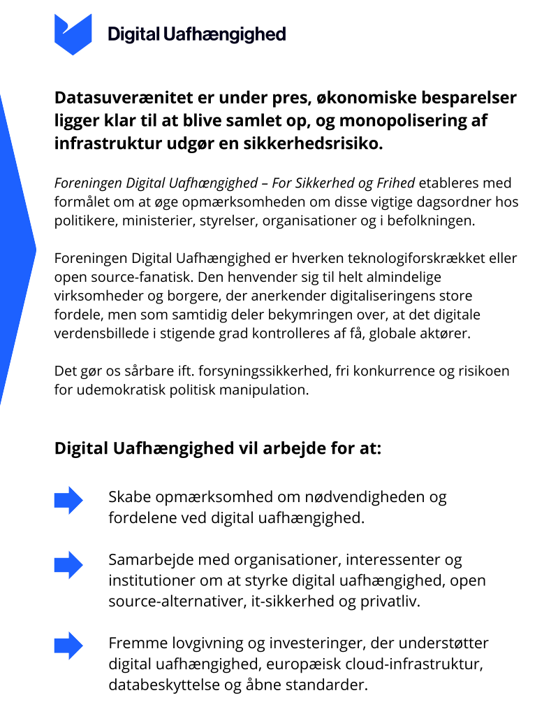 Datasuverænitet er under pres, økonomiske besparelser ligger klar til at blive samlet op, og monopolisering af infrastruktur udgør en sikkerhedsrisiko. Foreningen Digital Uafhængighed etableres med formålet om at øge opmærksomheden om disse vigtige dagsordner hos politikere, ministerier, styrelser, organisationer og i befolkningen.